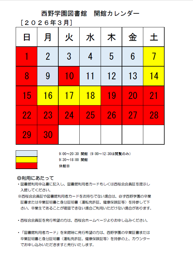 2026年3月の西野学園図書館の開館日になります。