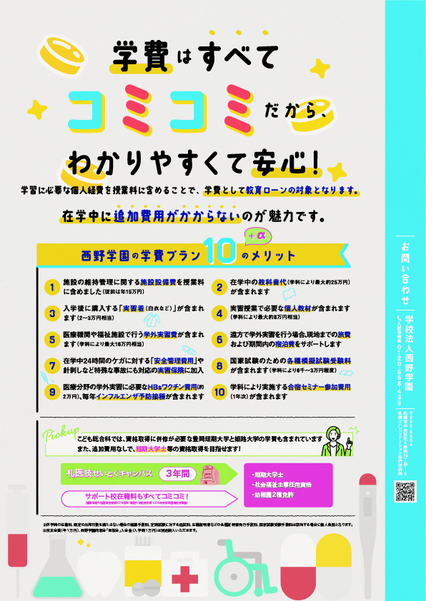※入学時に西野学園同窓会「西桜会」の入会金10,000円、在学中毎年4月に校友会費10,000円を別途徴収いたします。