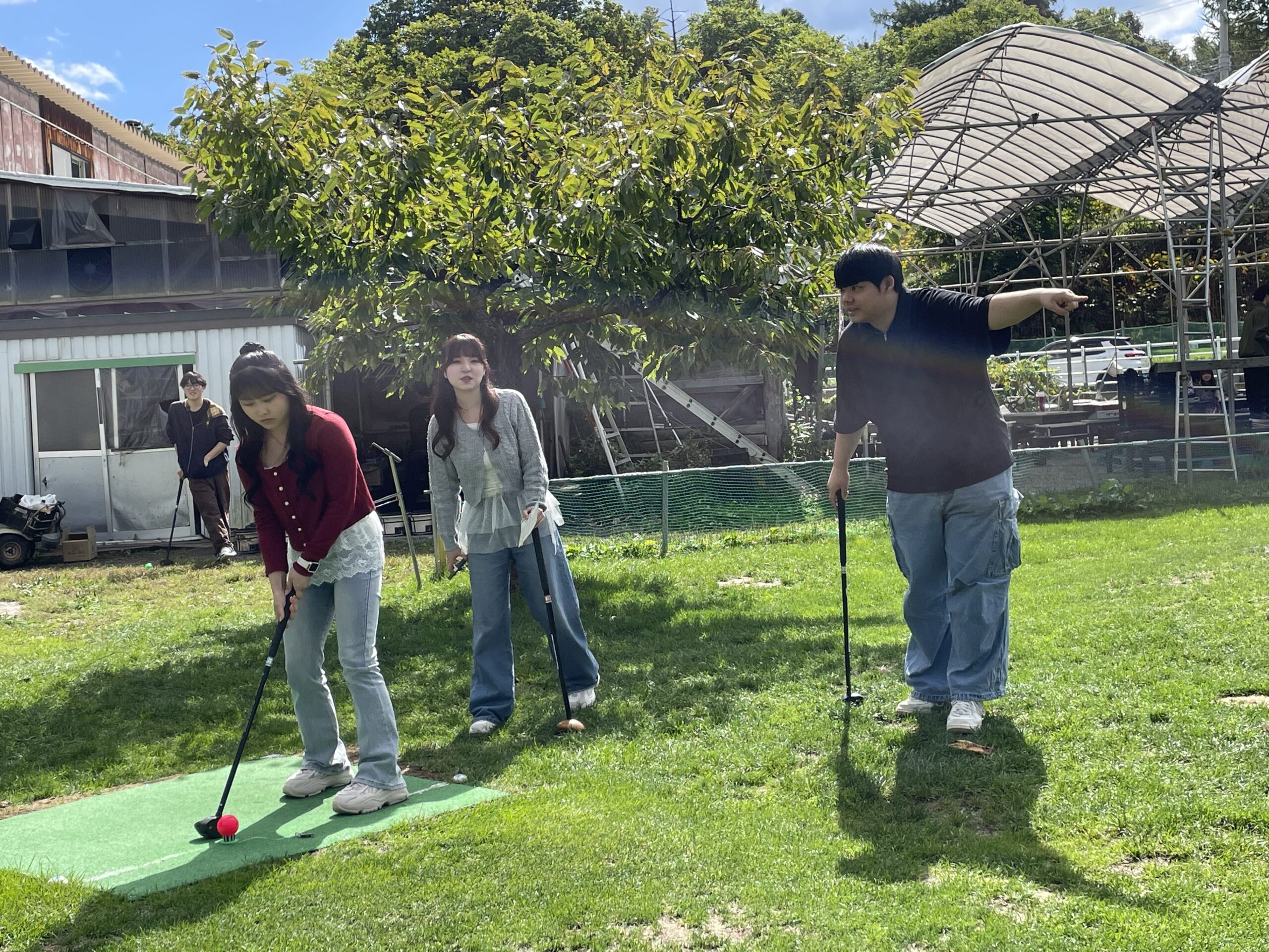 先輩と後輩とが同じグループになってパークゴルフを楽しみ