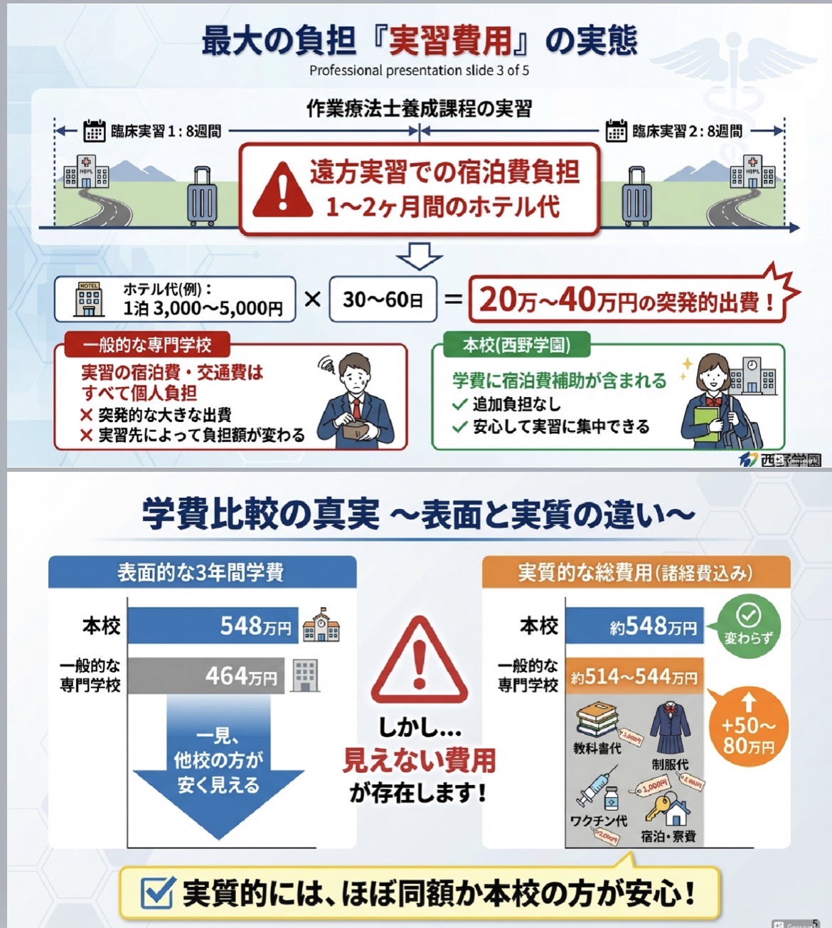 また、必ず行く必要がある実習でも学費に宿泊補助あるので追加費用無しで実習に集中できます!!(余程贅沢をすると×)