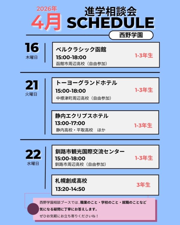 【2026年4月】西野学園 進学相談会のお知らせ📅✨道内各地で参加!