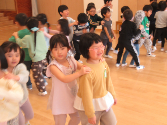 年長組は3クラスでホールに集まり、ジャンケン列車やドーナッツを楽しみました♪