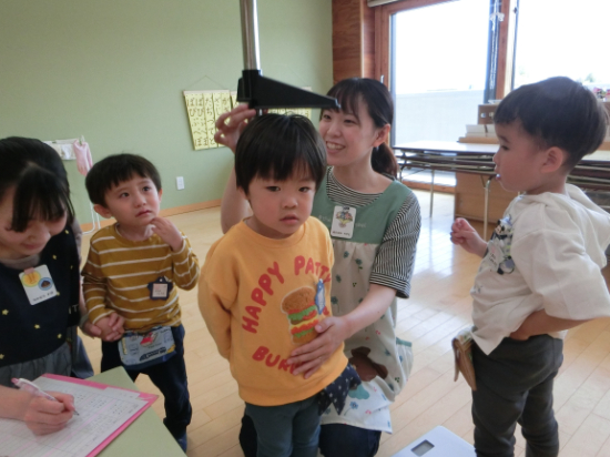 年長組の友達は4月中に身体測定を行いましたが、年少組は少しクラスが落ち着いてきた5月に行いました。