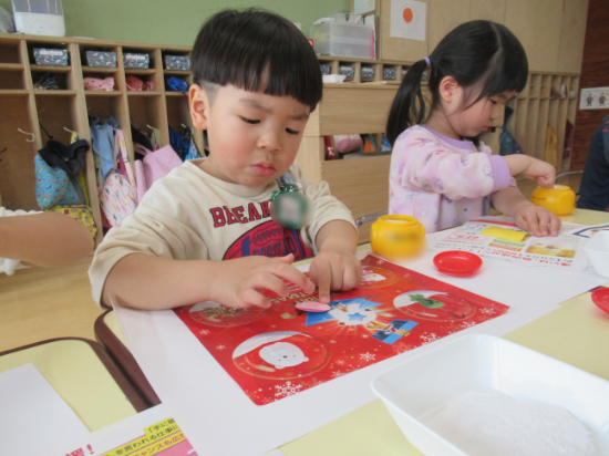 今はスティックのりやテープのりが主流かもしれませんが、実際に指を使って付けることで、のりの量の調整・端まで均等に伸ばす手指の動き・貼るものをしっかりと抑えることなどを指先の動きを通して学ぶことは幼児期の子どもたちにとっては大切な経験だと考えています。