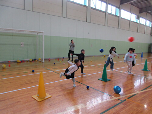 子どもたちはいろいろな大きさのボールをコーンに向かって何度も投げました!