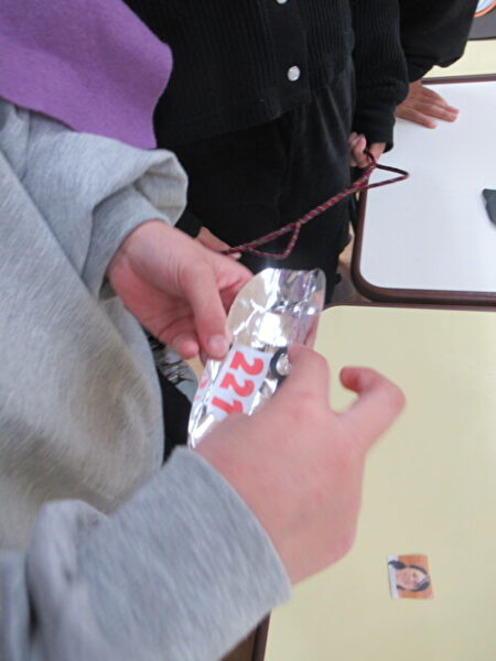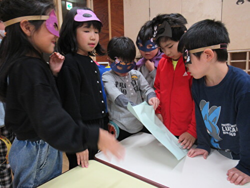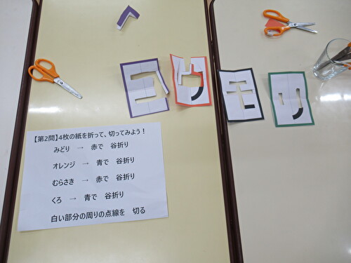 二人一組で1枚ずつ紙を折って、切ってみると文字が出てきました😊