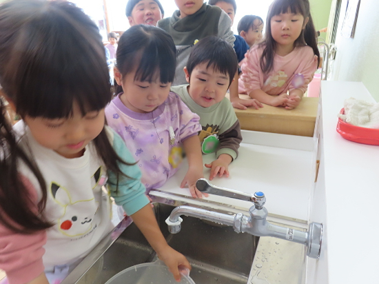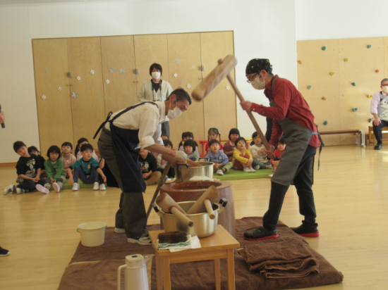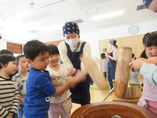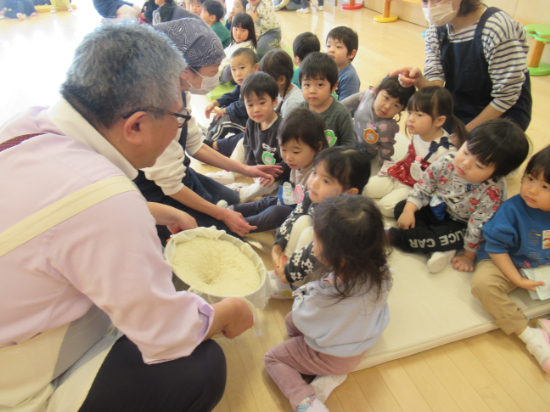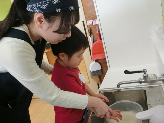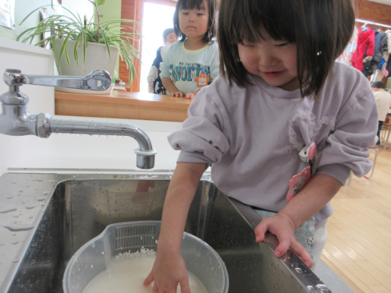 前々日には「おもちの作り方」という幼稚園オリジナルの紙芝居を読み、前日には米とぎを行いました。