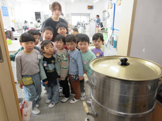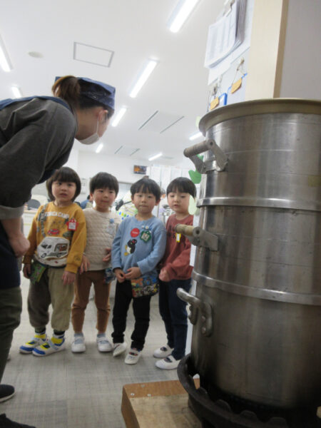 「3階建てだ!」鍋が積み重なっているのが不思議そうな子どもたちです。