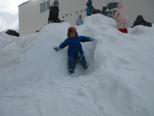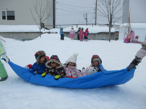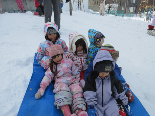 ブルーシートのそりは大人気!先生はへとへとになりながらも、みんなの為に頑張りました!