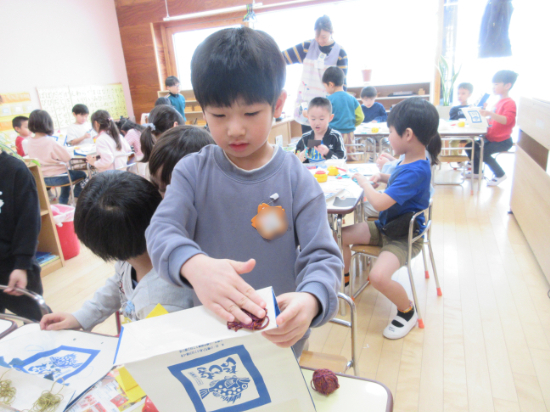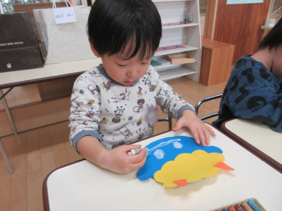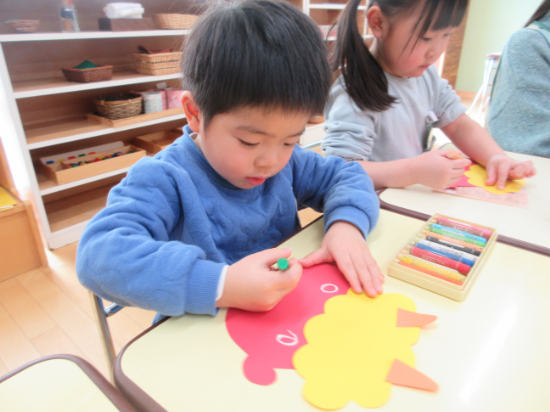 また、オニの顔はグループごとに赤・青・緑。白いクレヨンがよく映えて、さくらんぼさんたちにとっては新鮮だったようです。
