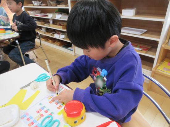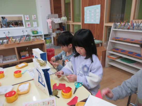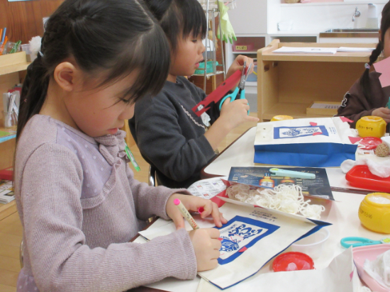 先日くりグループのお面作りの様子をお伝えしましたが、2月3日の節分当日に年長組とさくらんぼグループでお面作りを行いました。