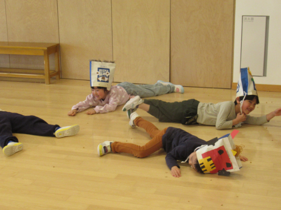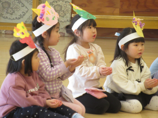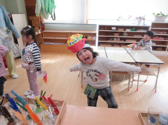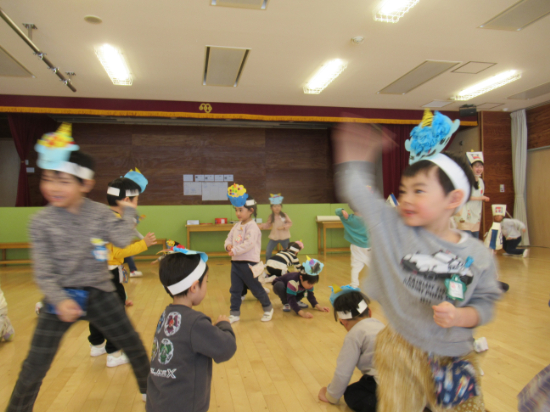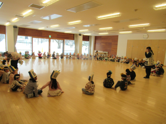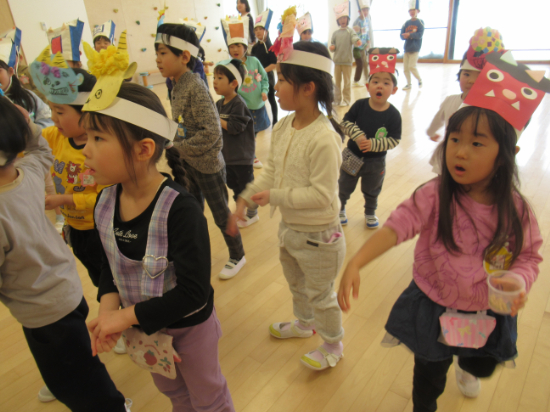 午後は年長組1クラスと年少組2クラスの3クラス合同で豆まきをしました!