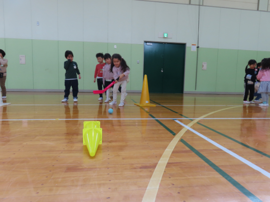 的に当てる方法は投げる、スティックでボールを打つ方法で先にゴールまでたどりついたチームの勝ちです!
