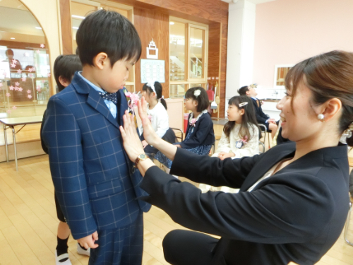 素敵な洋服に先生から胸に花をつけてもらい、