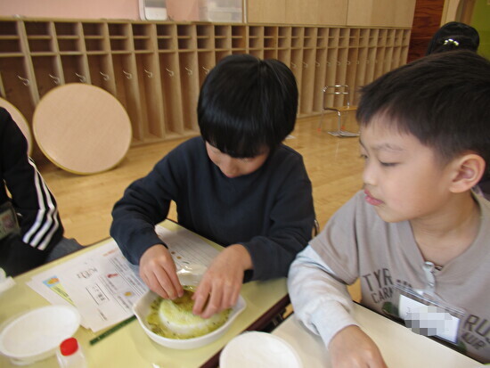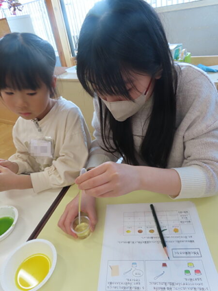 その汁をスポイトで取り、カップに入った液体に1滴ずつ入れていき、液体が透明になるまで何滴だったかを記録します✏️