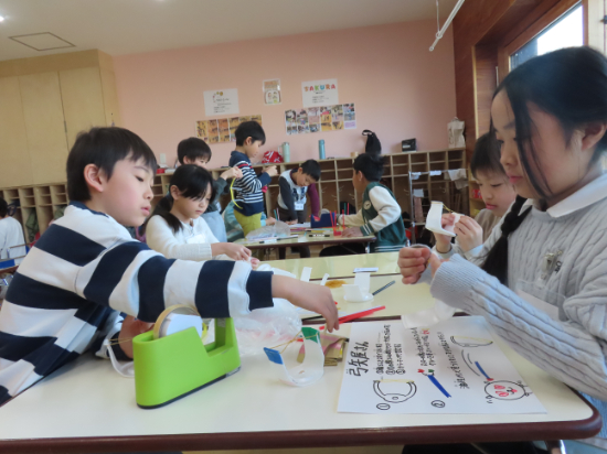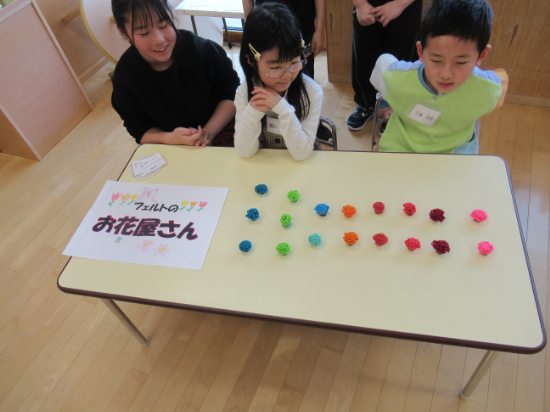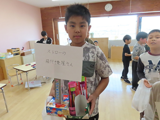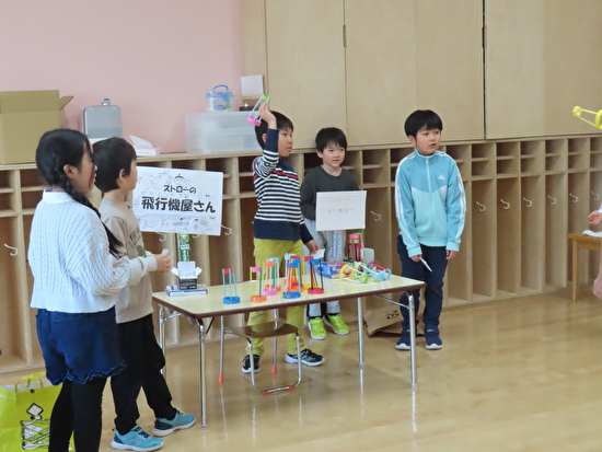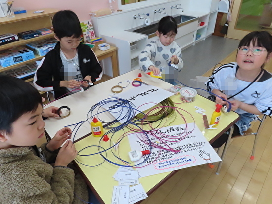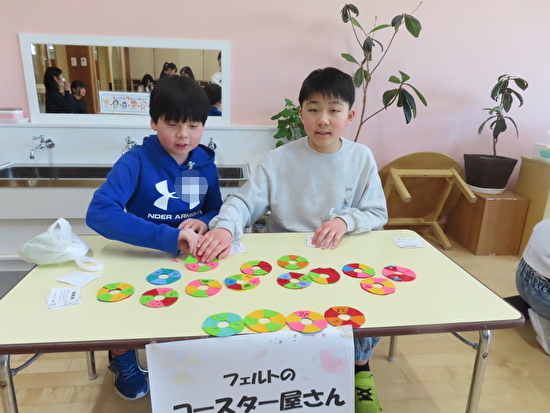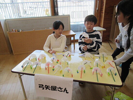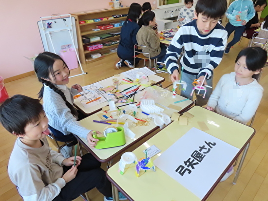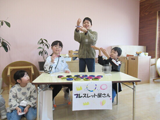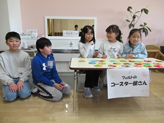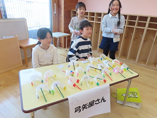 商品は事前に決まっており「フェルトのコースター屋さん」「フェルトのお花屋さん」「ストローの飛行機屋さん」「弓矢屋さん」「ブレスレット屋さん」の全5つのお店屋さんがあります😊