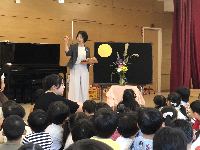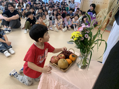 ♪ゆうやけこやけ を歌ったり、ホールには秋の果物も。