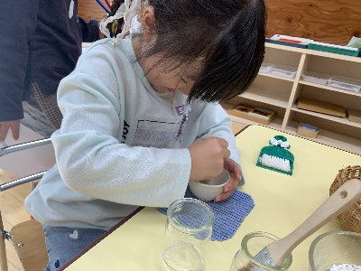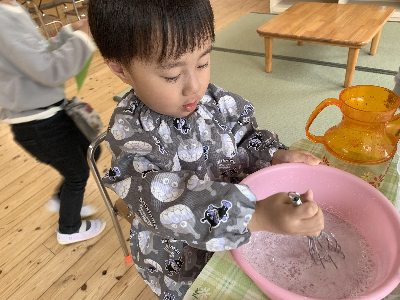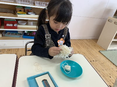 卵の殻を擦り、それを使って絵を描いたり、毛糸でぽんぽんを作っている子もいますよ。