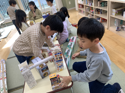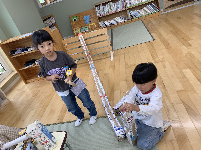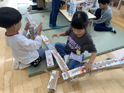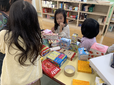 ガムテープをちぎってあげたり、箱を押さえてあげたり、友達同士の関わりも増えてきています。