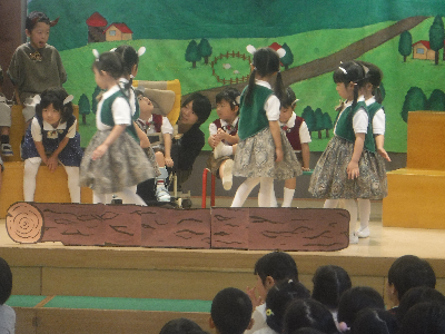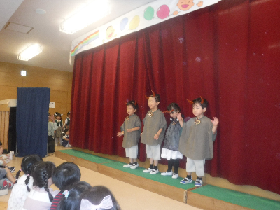 実際に着てみると、発表会当日が近付いている実感が沸いて少しドキドキ…。ですが、一人の子が“朝ご飯のうた”を歌い始めるとどんどん声が広がり、気付けば大合唱に!!どんぐり3らしい賑やかな雰囲気でリハーサルを行うことができました。