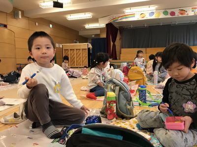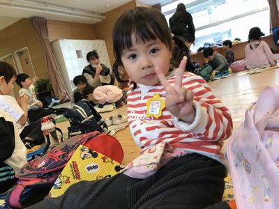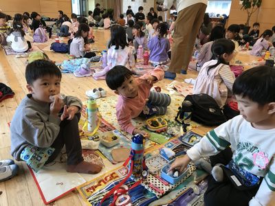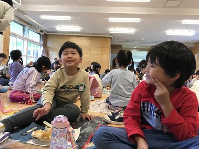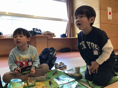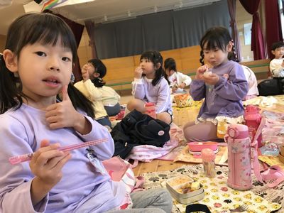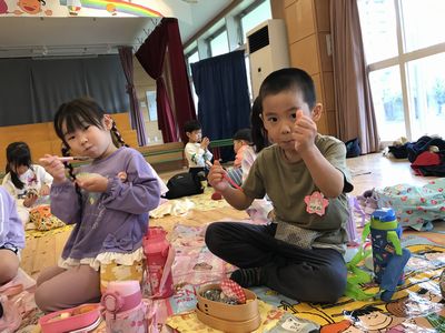 そしていっぱい歩き、お腹がペコペコになった子ども達にとって待ちに待ったお弁当!!今日は気温の低さや、朝雨が降り芝生が濡れていたこともあり、幼稚園に戻ってお弁当を食べました!
