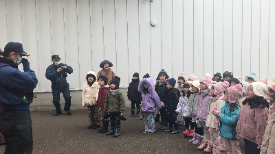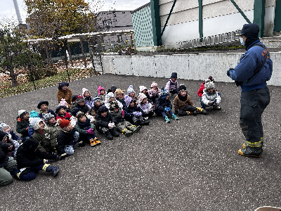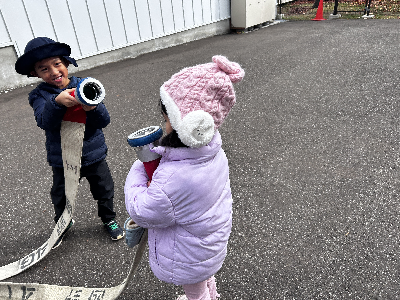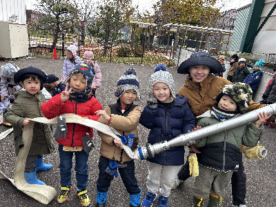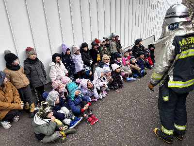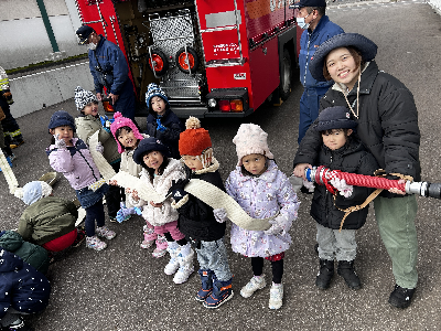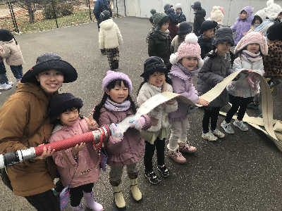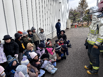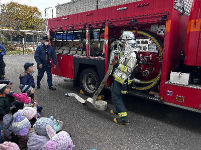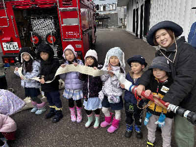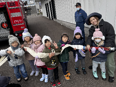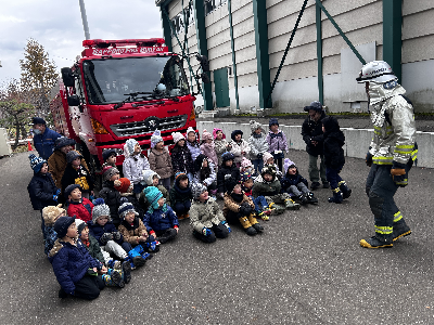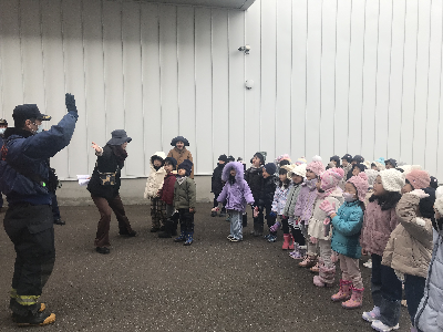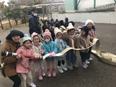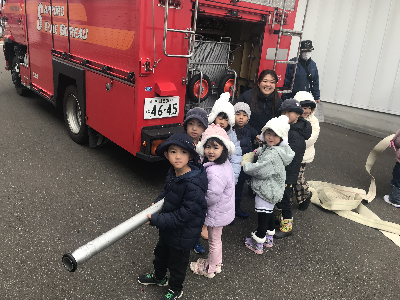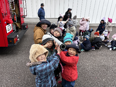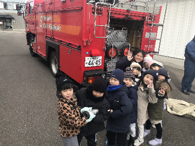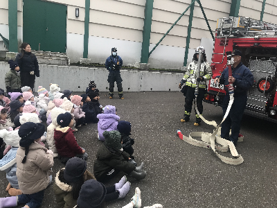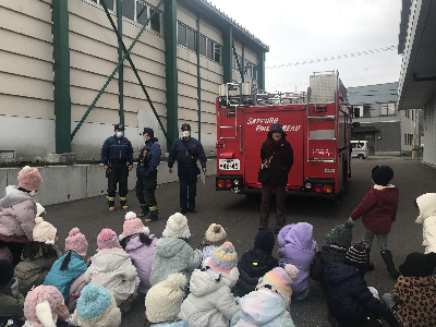 「朝に火事があったら出動して来れないんだって」という私の声に「え~!絶対火事ないといい!」とみんな。
