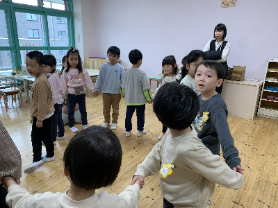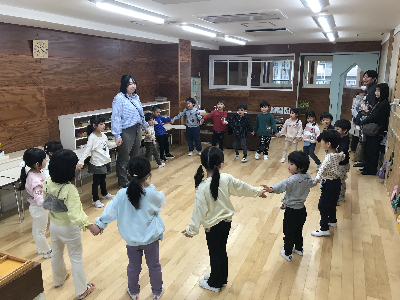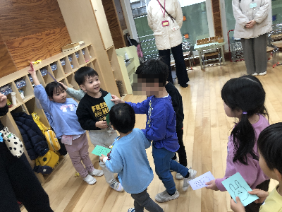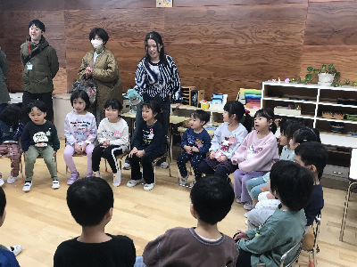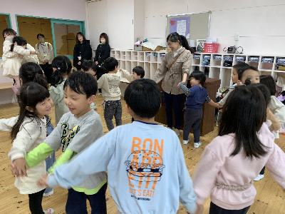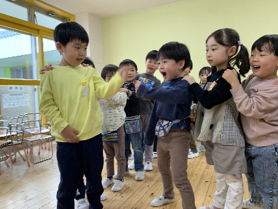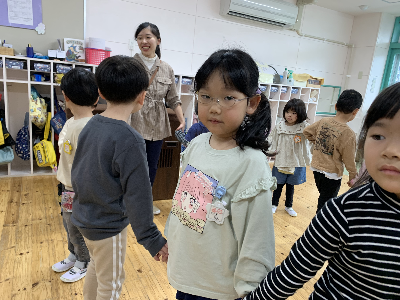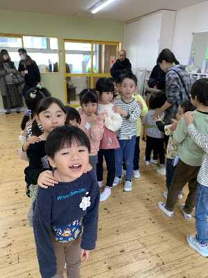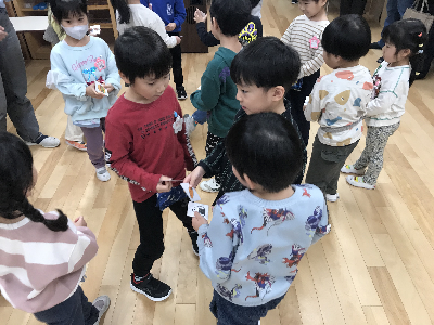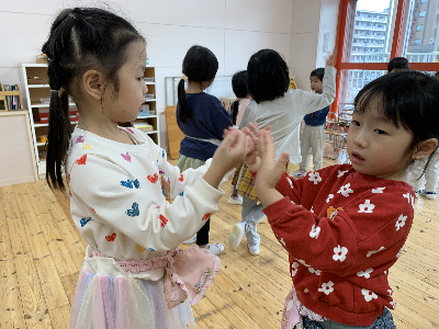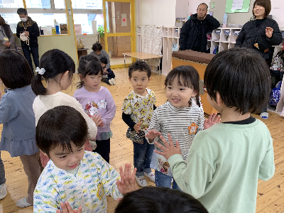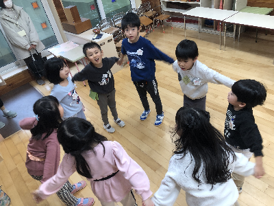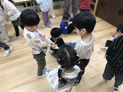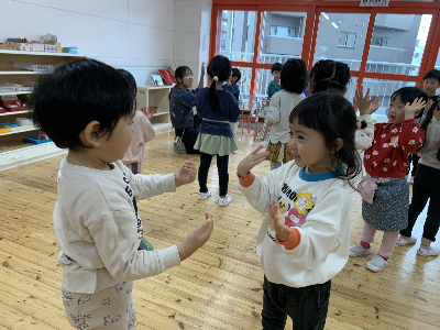 “だいこんつけ”という手を合わせる歌を代わる代わる色々な友達と行いました♪