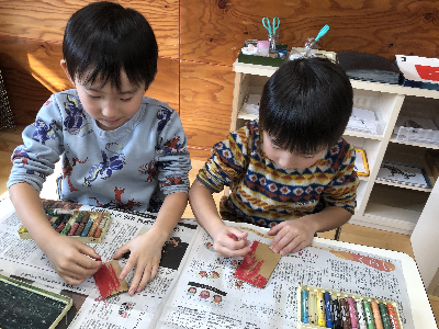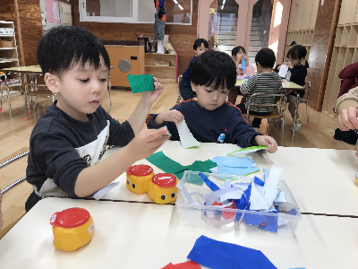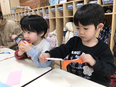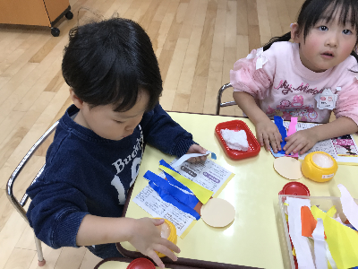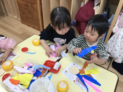 ちぎる姿、のりで貼る姿、顔を描く姿…どれも一生懸命なこどもたちでした(⌒∇⌒)
