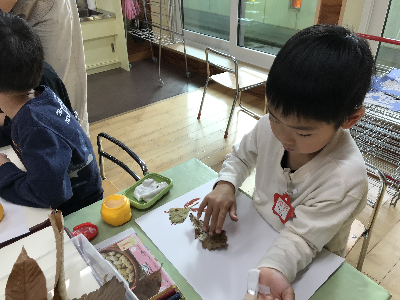 自分で好きな葉っぱを選んでのりで画用紙に張り付けて、そこにクレヨンで絵を書き足します。