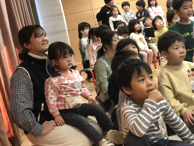 会場が大きな声で笑いに包まれるのにのいちごさんの声が聞こえるとまたお話に入り込むみんな。