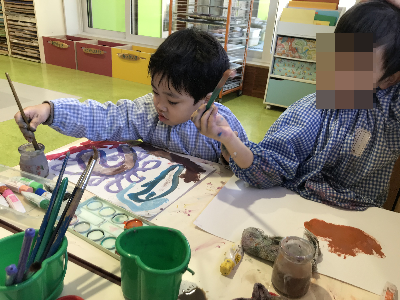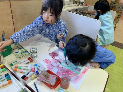 アトリエでは、指絵具やチューブ絵具が紹介され、思い思いに絵を描き楽しむ姿が。