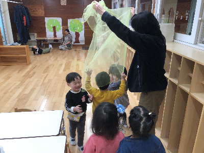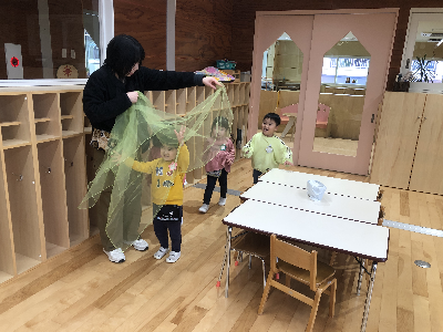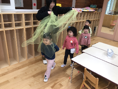 ひよこグループは先日よりも大きなネッカチーフで遊んだり、