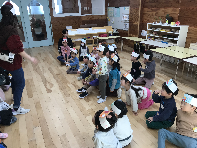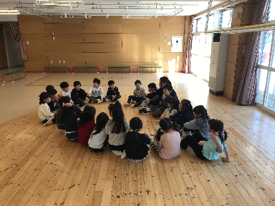 いつもと違う座り方をしてみんなでゆうか先生をみての活動です。