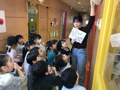 折り紙の後はみんなで飾り付けをする飾りを探しに園内をぐるぐる(⌒∇⌒)