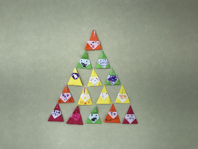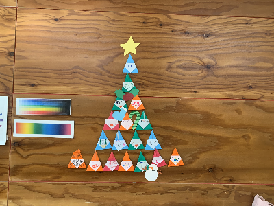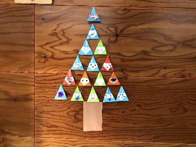 そのサンタさんを△の形に貼ると“クリスマスツリー”の完成!