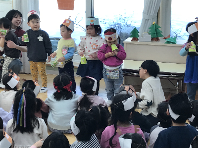 火曜日に制作したクリスマスお面をかぶって今日はみんなでお楽しみ会♪