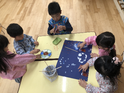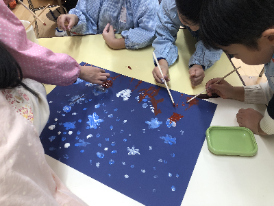 筆ではなく指や割りばしで木や雪を描いていましたよ。