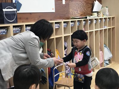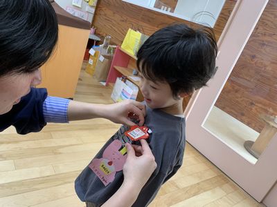 クラスでは先生にお胸飾りをつけてもらい、ちょっぴり得意げでホールにやってきます。