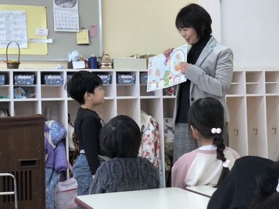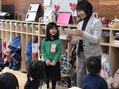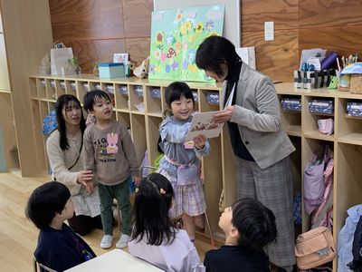 クラスで誕生会の続きをしている時に、園長先生・まい先生が来てくれて、お誕生さんにカードを渡してくれます。