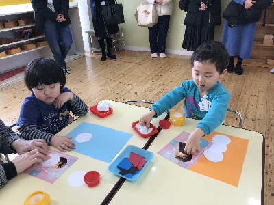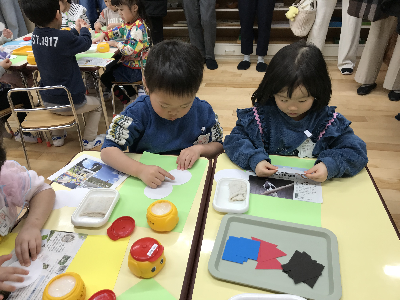 「これくらいだったよね」「こっちに貼ろうかな」「帽子はこれにする!」「先生一緒にやろう?」と自分の気持ちを声に出して取り組む姿も見られました!