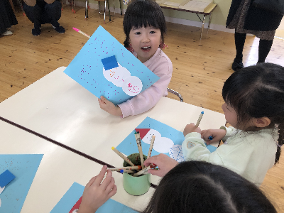 最後は完成した作品をお母さんお父さんに見せて嬉しそうな笑顔!