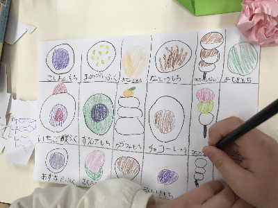 おもち屋さんのメニュー表を作成している子も…!とても美味しそうなおもちばかり♪