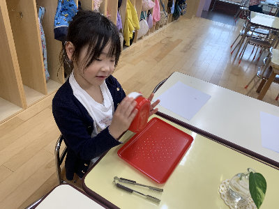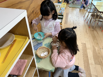 他にもシールをつかった作品つくりや卵の殻をする活動に夢中な様子も…。