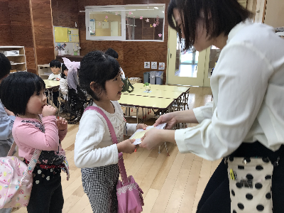 今朝は「新しい先生は誰かな?」「仲良しの友達とクラスが離れて不安だな」等のドキドキした気持ちも持ちながらも「ポプラのバッチになったんだよ!」「見て~○○組になったよ!」とバッチを見せて喜ぶ姿や大好きな友達や先生に会えて嬉しそうにする一人ひとりの姿がありました。