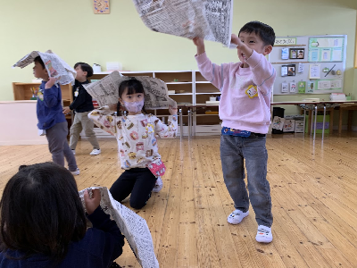 すずらんさんは新聞をちぎってワーッ!