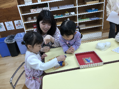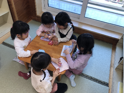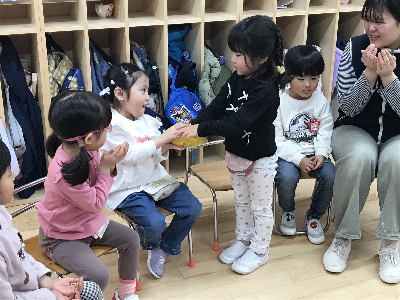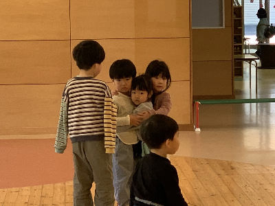 上靴をはかないうさぎさんの上靴をもって追いかけてくれる姿、顔を覗き込んで「泣いてるの?」と心配そうに声をかける姿、帽子を被せてあげようとしていたり、ジャンバーを直してあげてたり、先生が見ていない所でも小さな友達のお手伝いを頑張ってくれる姿を沢山見かけています。