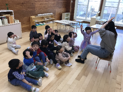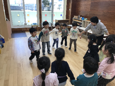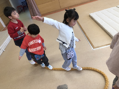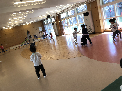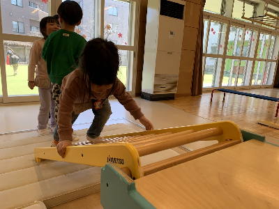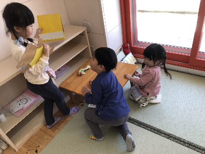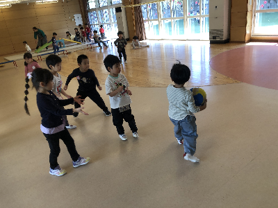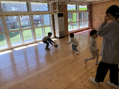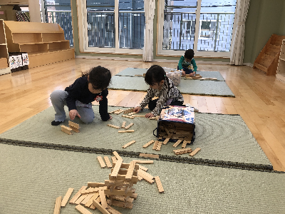 初期はまだ先生が考えた遊びを行う事が多いですが、今後は子どもたちと一緒に考えて遊んだり、前の遊びの続きをしたりと発展していったりしますよ♪