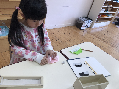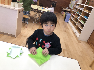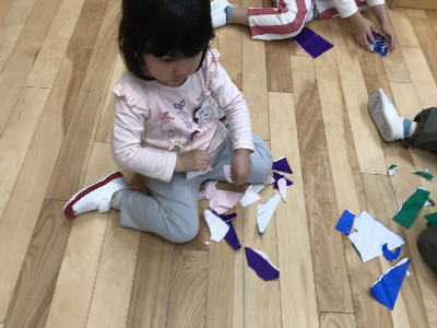 ゆりさんは折り紙をちぎってワーッと盛り上がっていました。