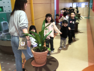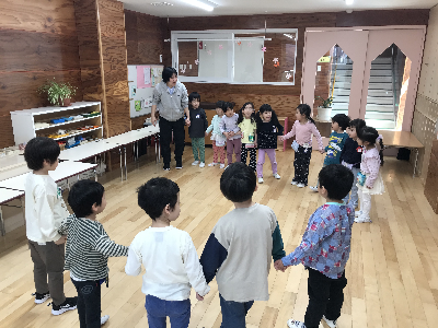 自由選択活動で遊びの範囲が広がったので、ほしフロアの友達が2階で遊んでいたり、つき・たいようフロアの友達が園庭で遊んでいたりと自由に過ごしていたので、「次はクラスで遊ぶ時間だよ~!クラスに戻るよ。」の声掛けのタイミングではなかなか戻らず…💦