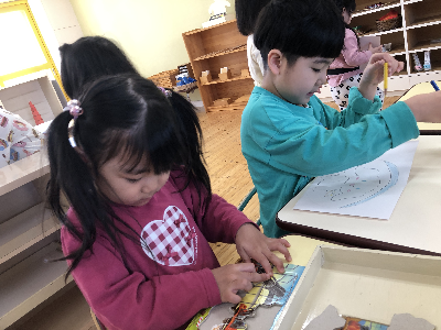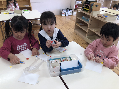 今日は登園して朝の支度を済ました後は自分たちで遊ぶ場所を選んで早速、自由選択活動の時間です♪